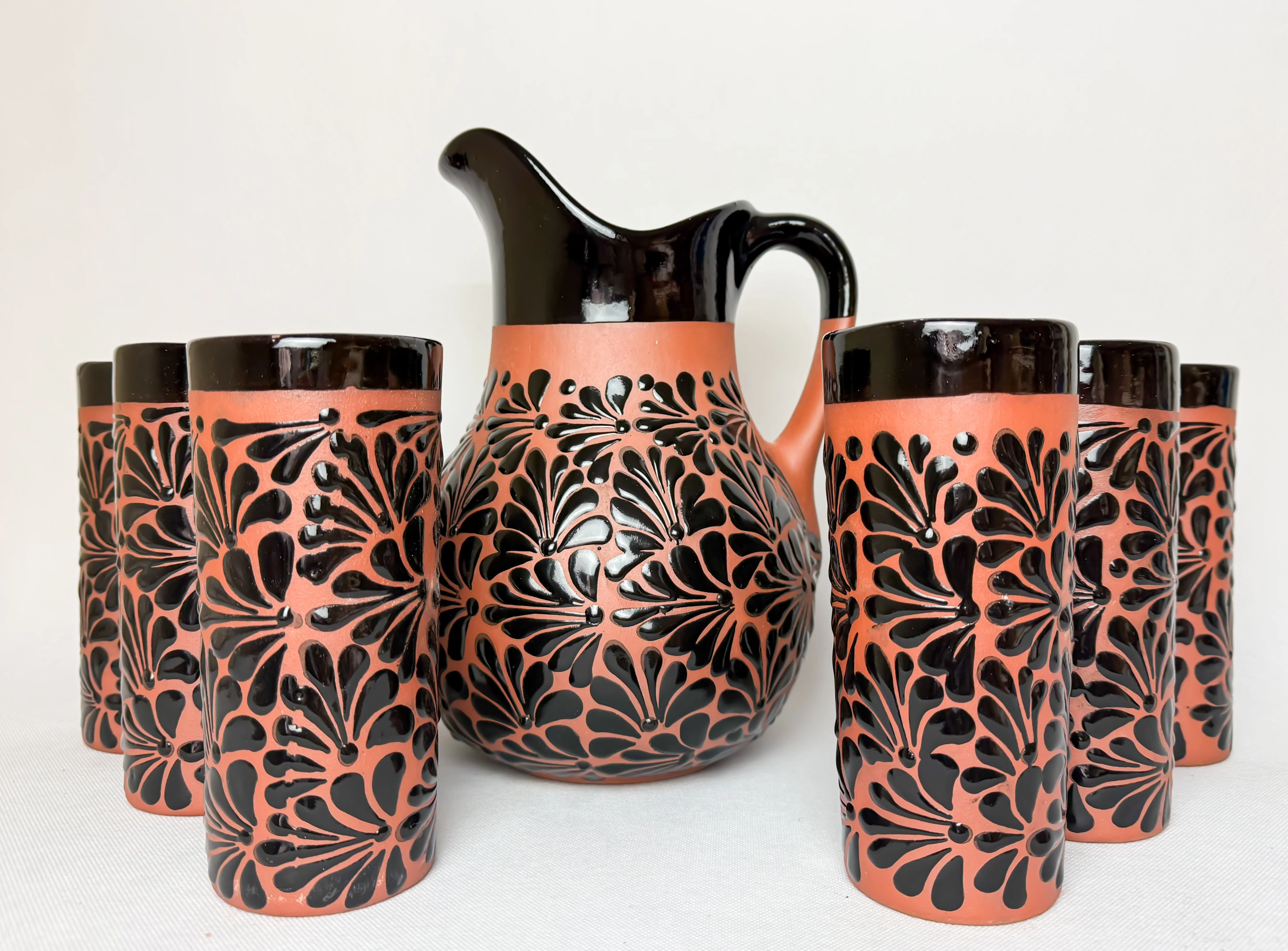 Clay Water Pitcher Set 7 Pc Mexican Clay Pitcher With Tumblers Jarra Con Vasos Black
